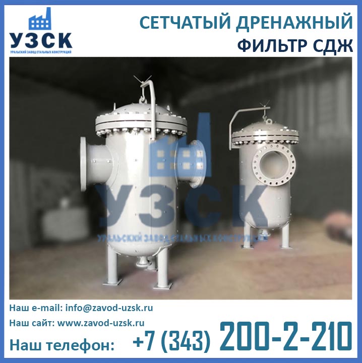 На формирование цены дренажного фильтра влияют следующие факторы: материальное исполнение, конструктивное исполнение, стоимость сырья в момент изготовления, комплектация, необходимость доставки в другой населенный пункт, срочность выполнения работ по изготовлению, прочие предпочтения заказчика. Уральский завод стальных конструкций изготавливает фильтры СДЖ-700 любого типового исполнения, а также нестандартные фильтры СДЖ 700 мм по чертежам заказчика или техническому заданию. Дополнительно к фильтрам СДЖ у нас Вы можете заказать сменные фильтрующие элементы любой тонкости фильтрации, ответные фланцы, прокладки и крепеж. По запросу изготавливаем также фильтры СДЖ-К-700 с концевым затвором. Для того чтобы узнать какова цена на фильтр СДЖ Ду700 в Череповце с необходимыми Вам характеристиками, отправьте запрос в отдел продаж завода УЗСК по координатам, указанным в разделе «Контакты».