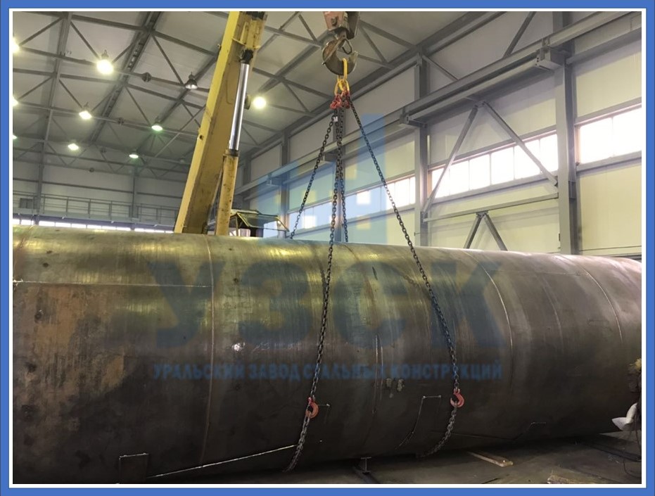 На заводе готовятся листы стали с максимальным размером 2 500х10 000 мм. Их завальцовывают на нужный радиус, чистят срезы и упаковывают. Также готовят сборные детали днища. Стыковка всех элементов ведется на площадке, методом сварки. Рабочий чертеж указывает последовательность соединения промаркированных заготовок. Швы подвергаются неразрушающему контролю.